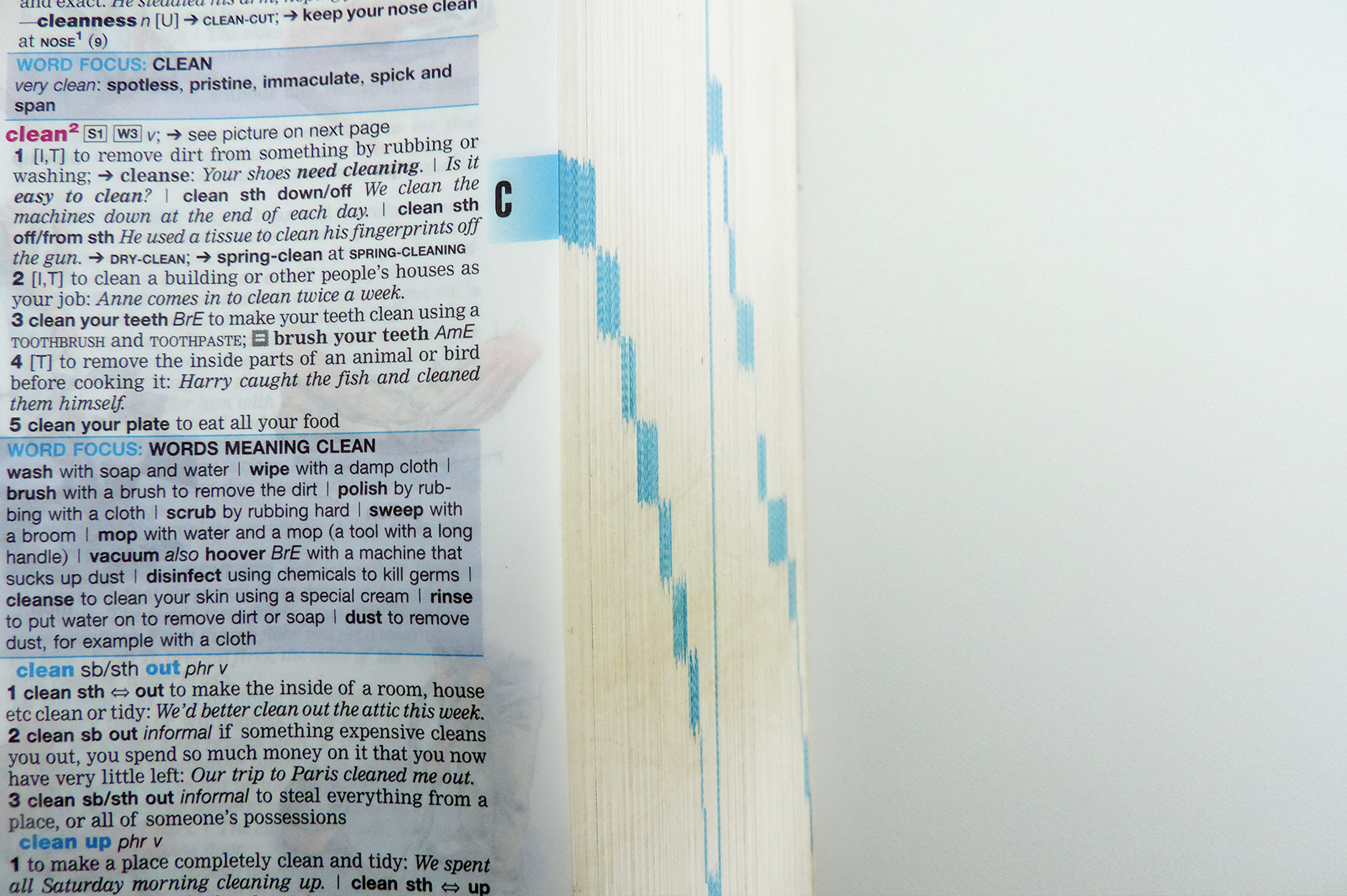 Dentro da entrada selecionada, temos várias informações referentes a ela. Algumas palavras possuem derivadas ou podem ter mais de um significado. Nesses casos, podemos ter várias definições na mesma entrada, separadas por números, ou várias entradas da mesma palavra, diferenciados por uma numeração acima deles, como ilustrado no exemplo abaixo. (clean¹, clean², clean³, etc.)